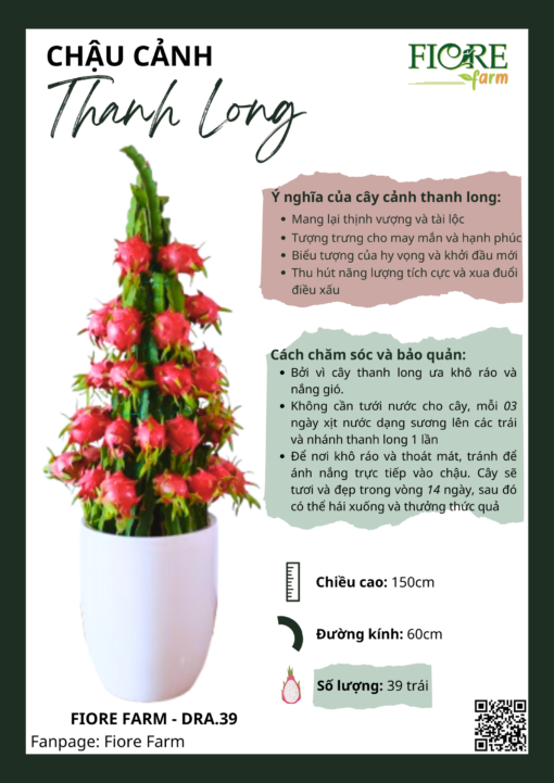 Chậu hoa với 39 trái thanh long là sản phẩm cao cấp, thường được sử dụng trong các không gian lớn như sảnh khách sạn, hội trường, hoặc làm quà tặng cho các dịp quan trọng. Với sự kết hợp hoàn hảo giữa số lượng trái và tính thẩm mỹ, chậu hoa này sẽ làm nổi bật không gian sống của bạn